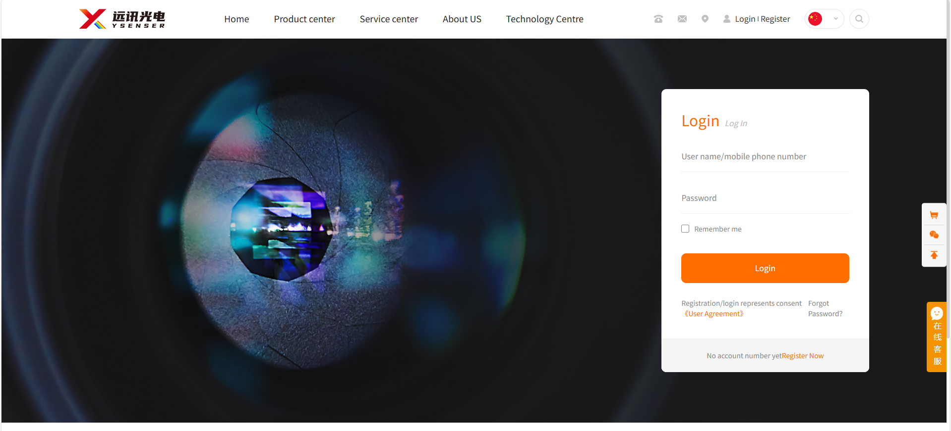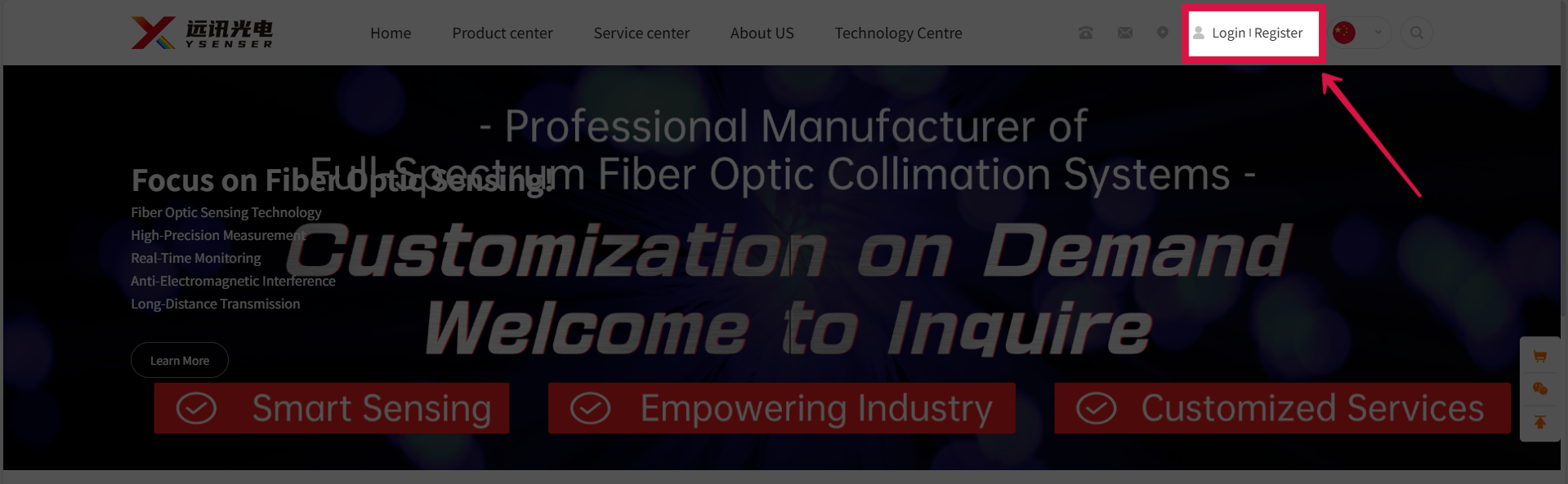 Step1.Open the homepage of Yuxun Optoelectronics' official website (www.ysenser.com) and click the "Register" button at the top right corner.